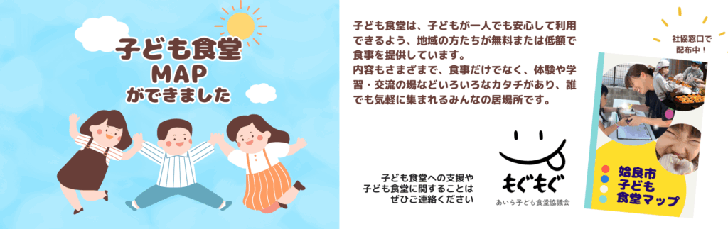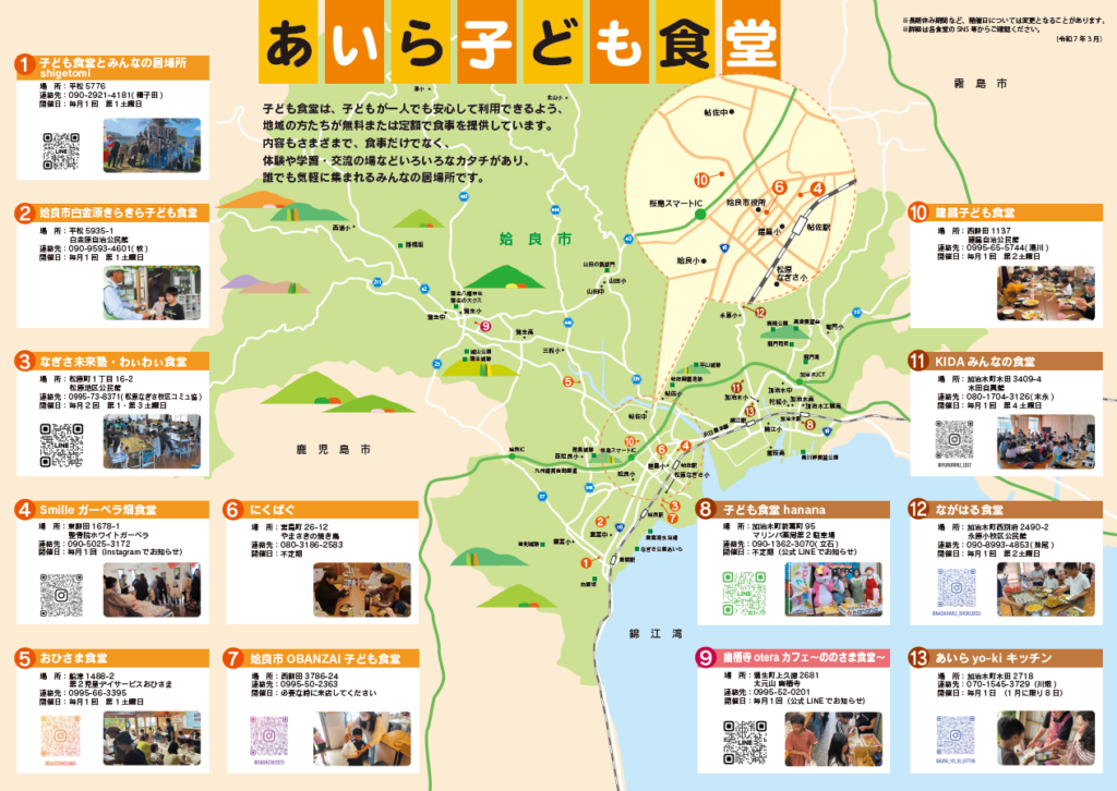 子ども食堂のマップができました!現在、姶良市内の各地域に子ども食堂が増えてきています。令和7年12月現在の食堂数 16食堂 子ども食堂は誰でも集まれるみんなの居場所子ども食堂サポ―ター募集中!子ども食堂は、子どもが一人でも安心して利用できるよう、地域の方たちが無料または低額で食事を提供しています。内容もさまざまで、食事だけでなく、体験や学習・交流の場などいろいろなカタチがあります。各食堂の紹介(準備中)